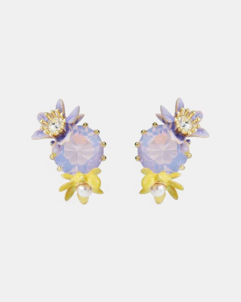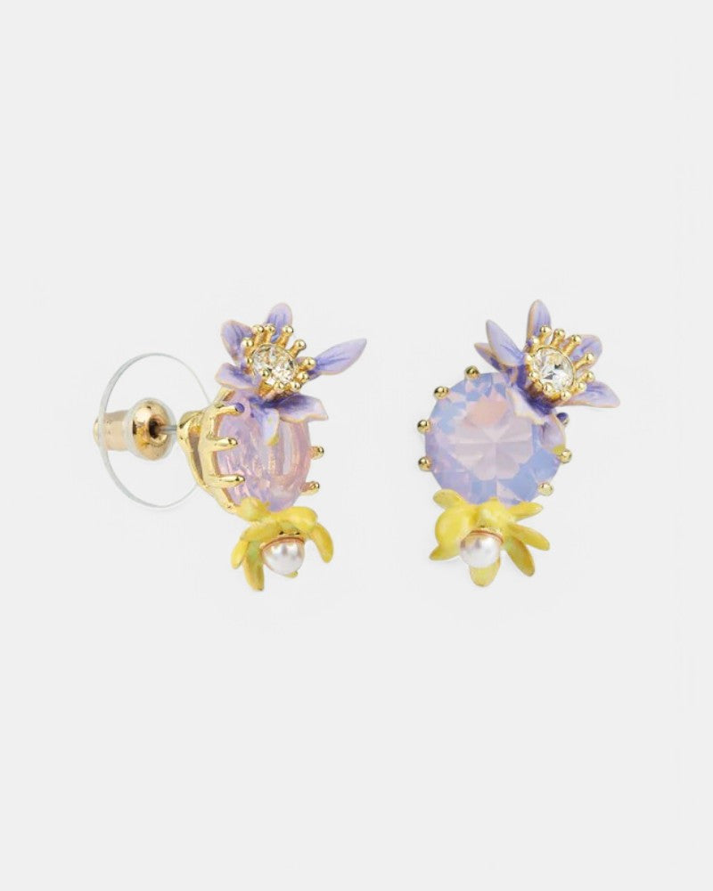 Pendientes piedra redonda de cristal facetado violeta translúcido, adornado con dos pequeñas flores de magnolia de color violeta pastel y amarillo verdoso, esmaltadas a mano.