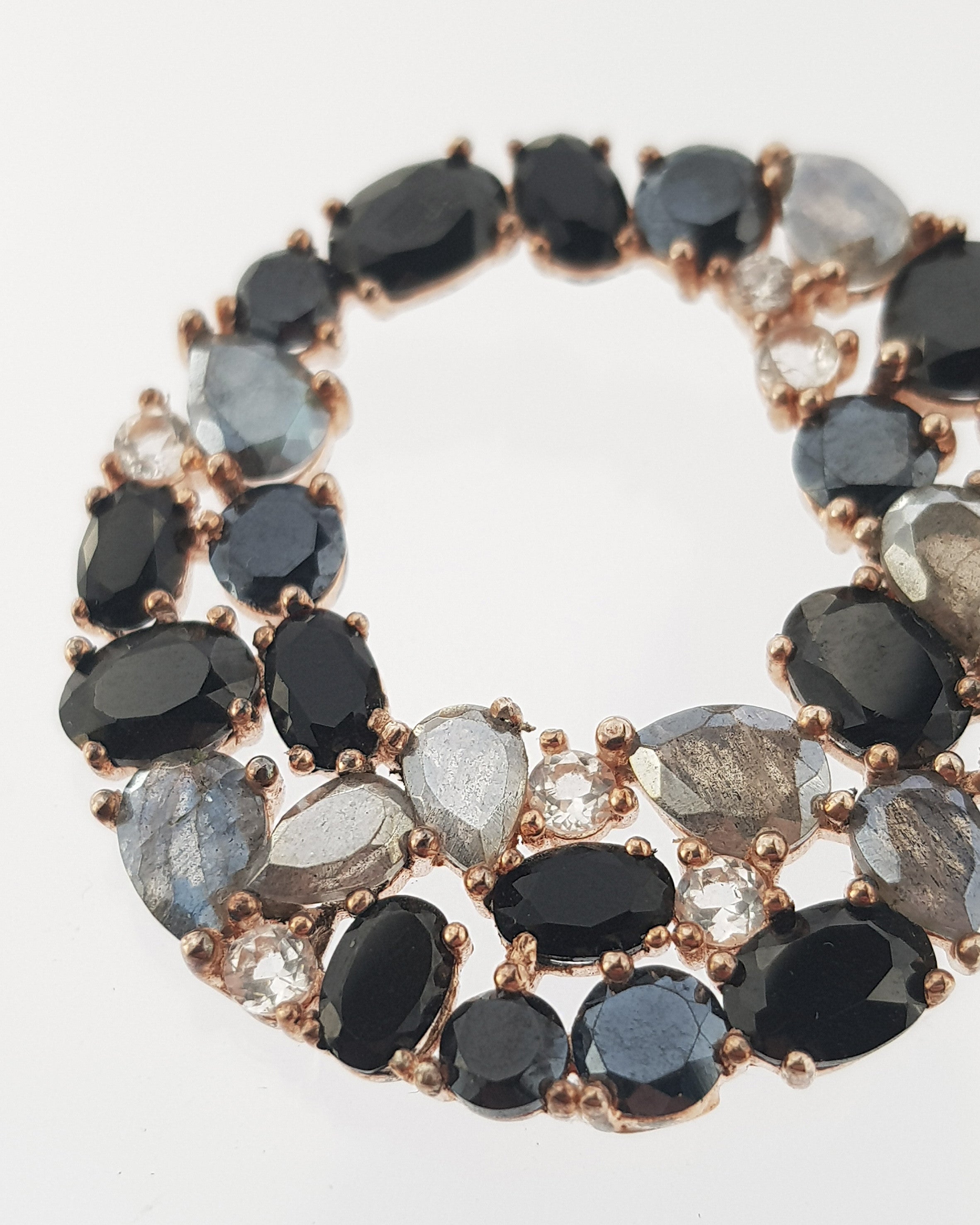 Montados en plata color champagne, con espinelas color negro y labradoritas engastadas a mano.