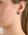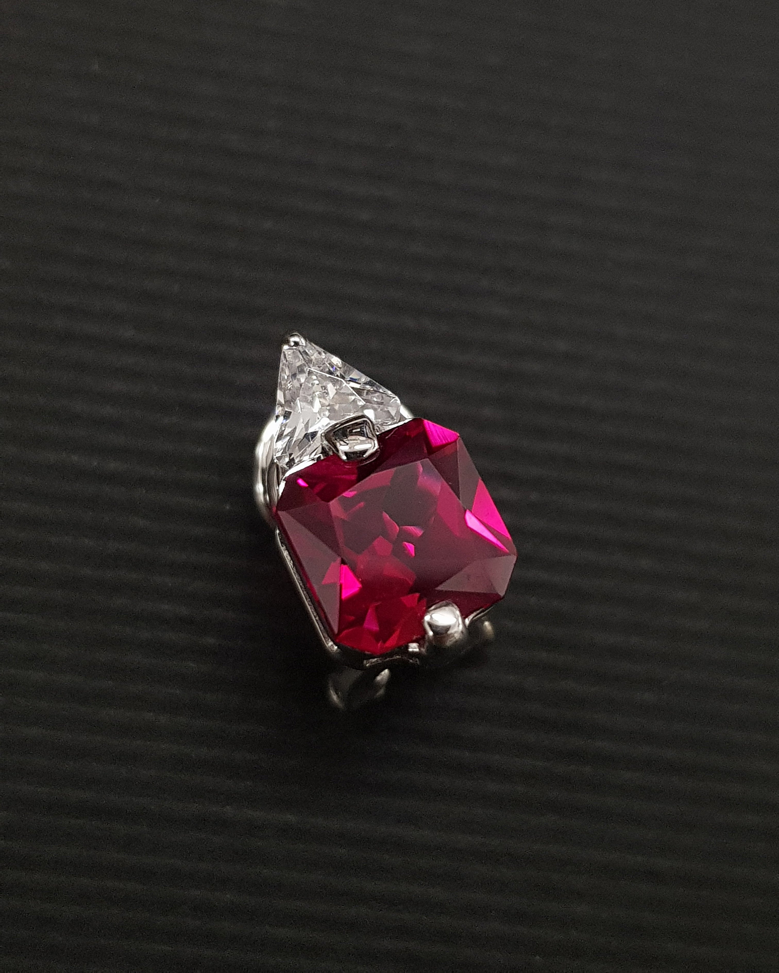 Diseño de botón en dos piezas, una en talla princesa de color rojo y otra blanca con corte trillion
