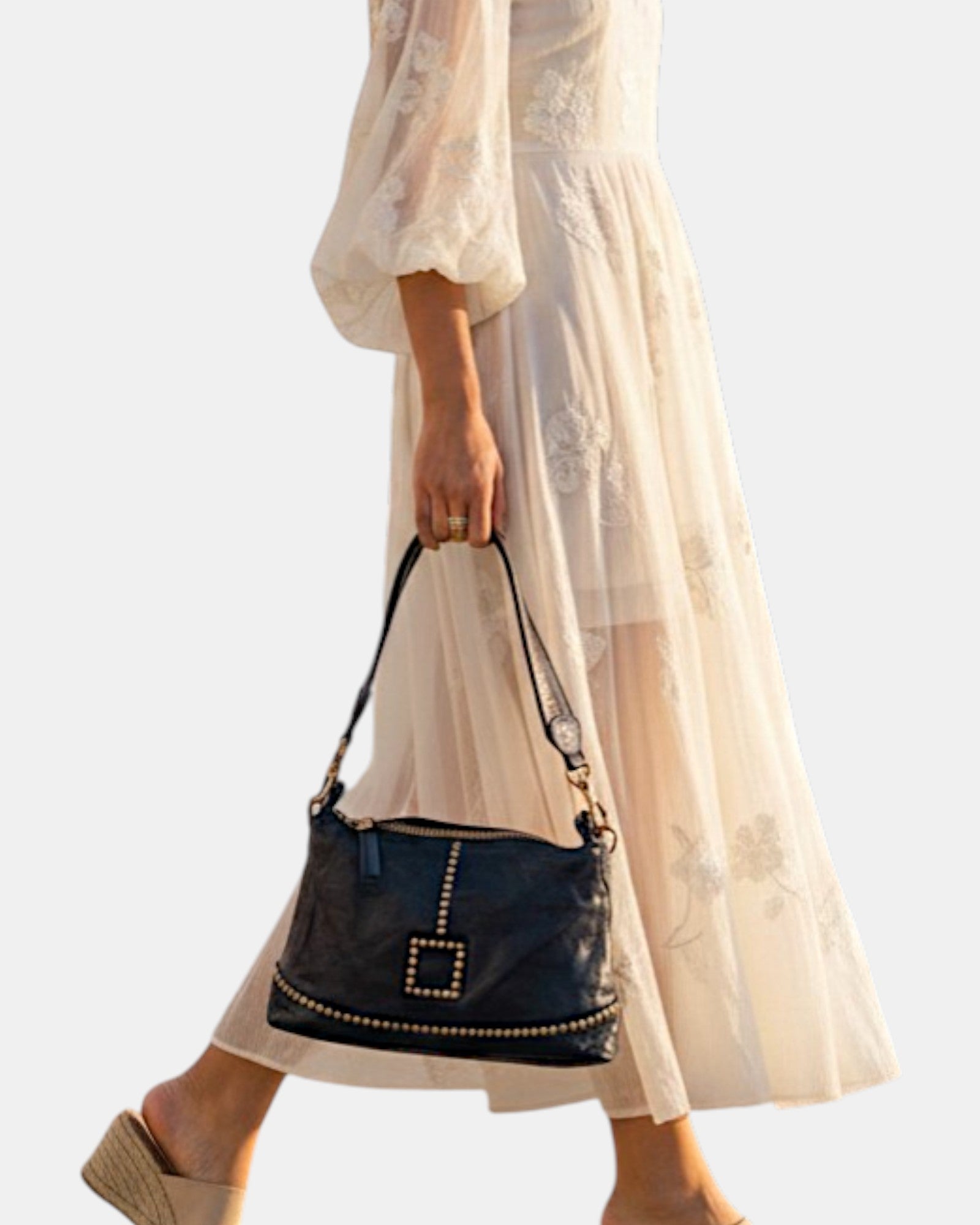Este modelo destaca por su sofisticado contraste entre el cuero azul profundo y la ornamentación de tachuelas doradas dispuestas meticulosamente de forma vertical y en la base. Su diseño compacto lo convierte en el compañero ideal tanto para eventos nocturnos como para elevar un look casual de día.