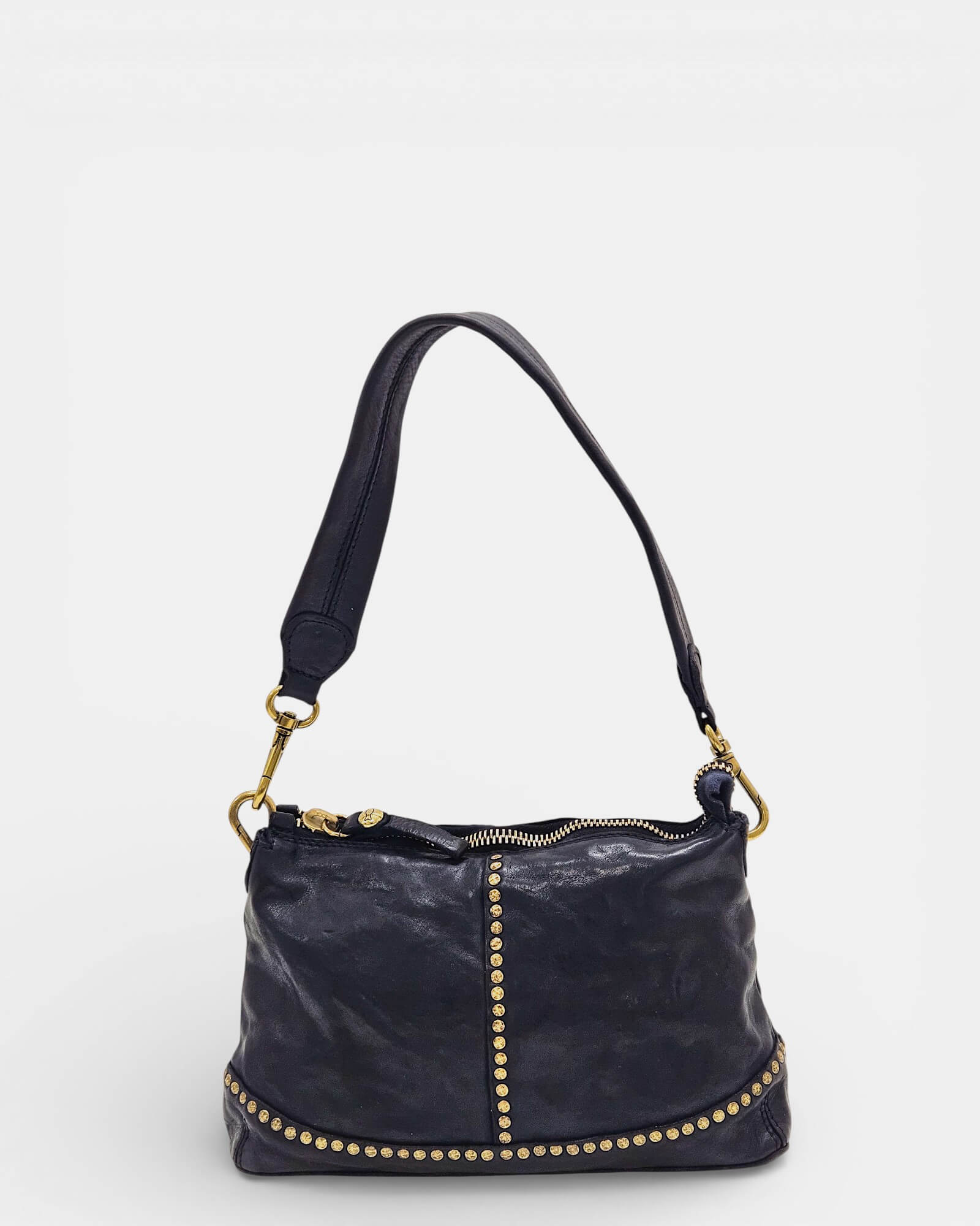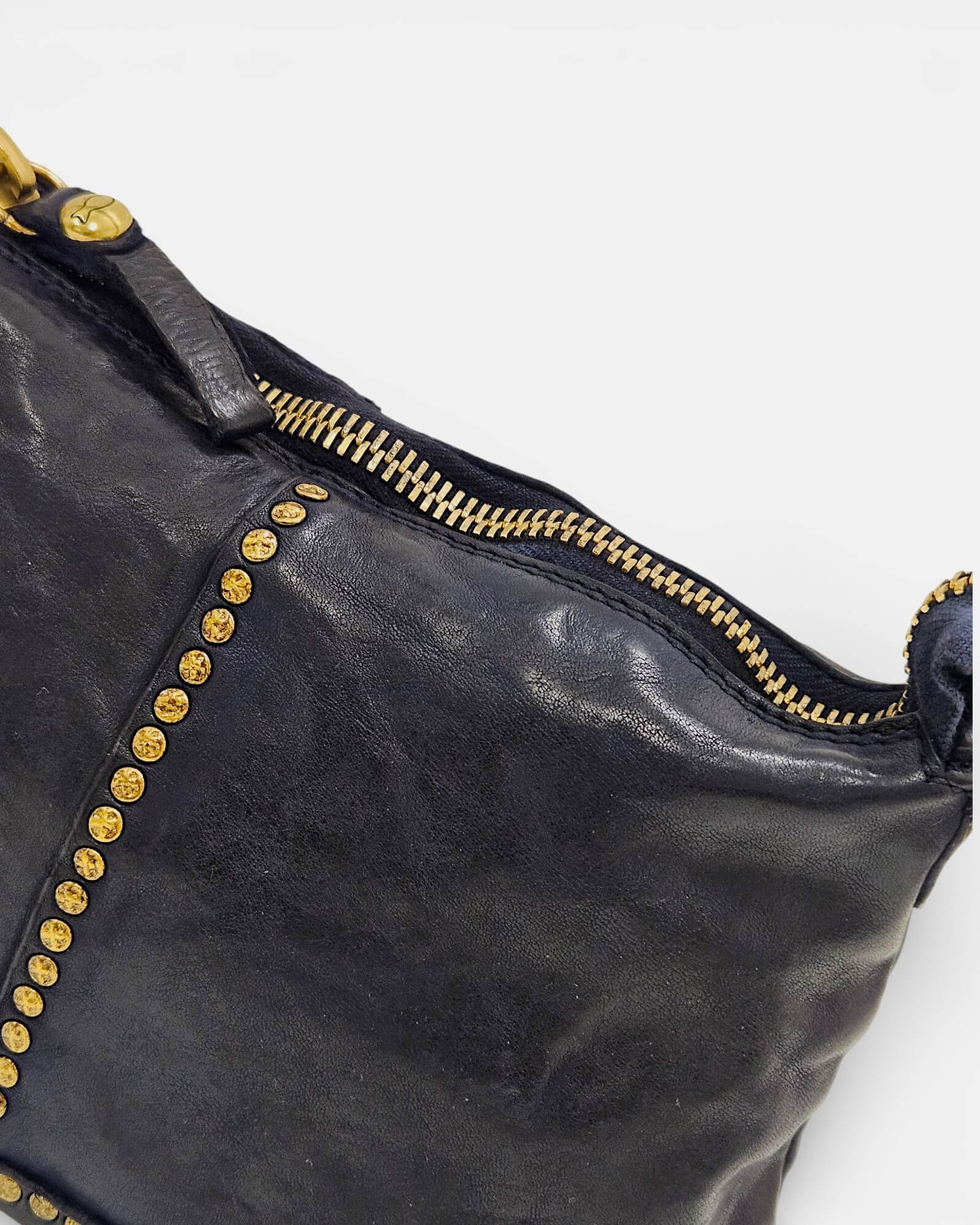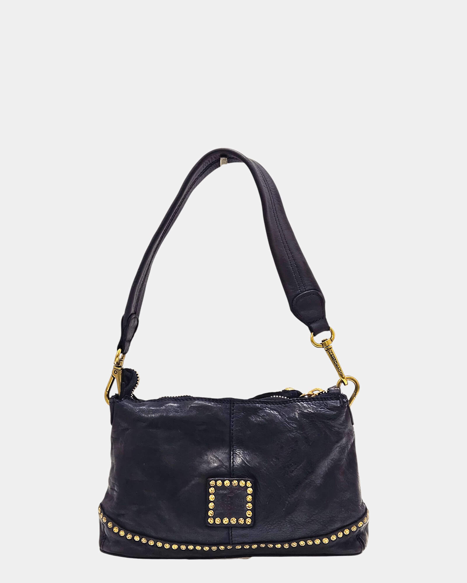 Sello de Autenticidad: Logo Campomaggi troquelado y reforzado con tachuelas en la parte posterior.