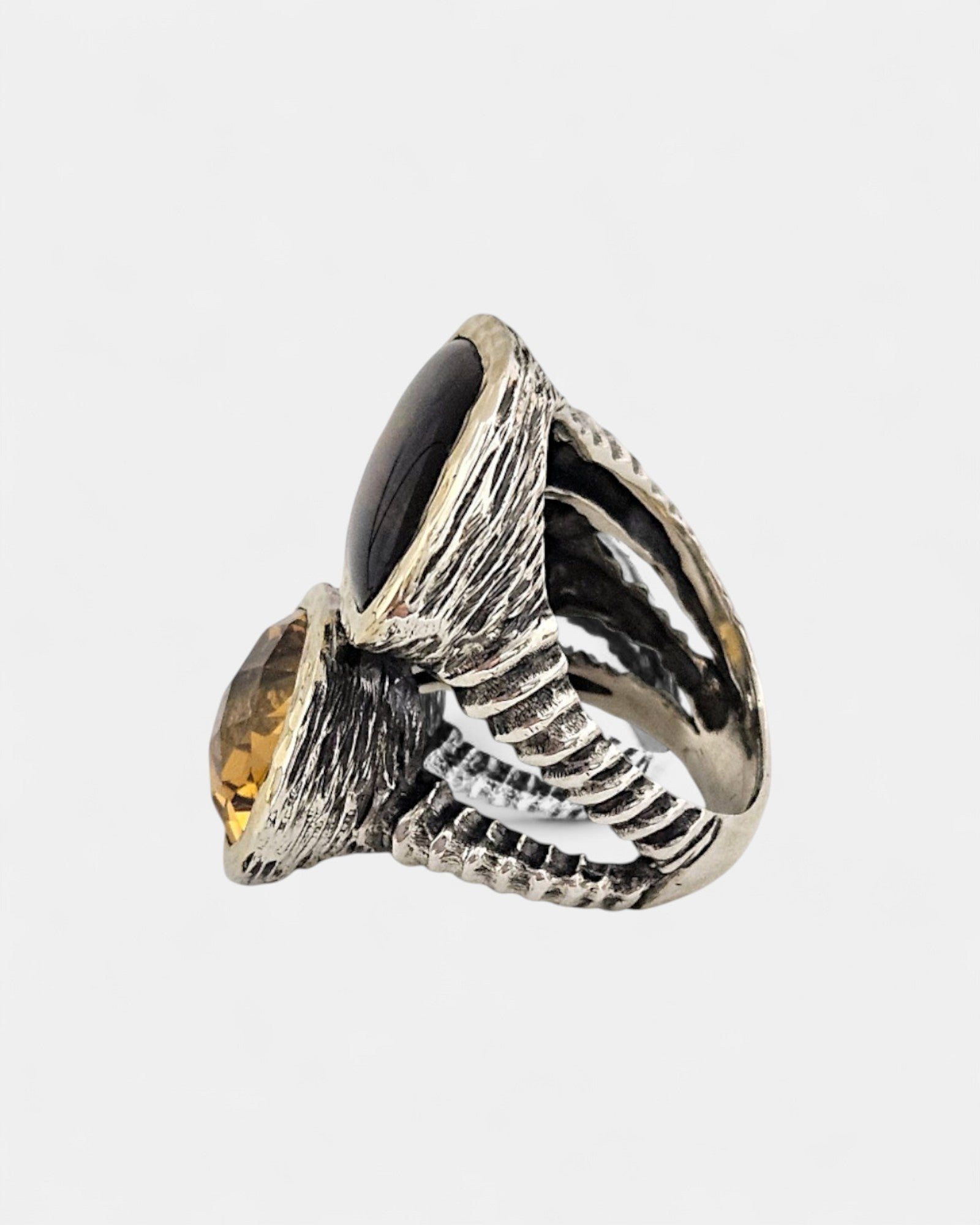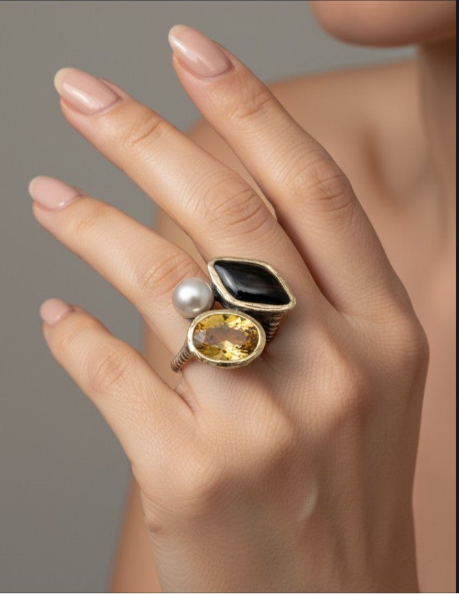 Este anillo artesanal combina tres elementos naturales únicos: la elegancia de la perla, el brillo cálido del cuarzo whisky y la textura orgánica del amonite fósil. Cada detalle refleja la belleza de los materiales en su estado más puro, fusionados en una montura de plata labrada con detalles en oro, que aporta un acabado sofisticado y atemporal.