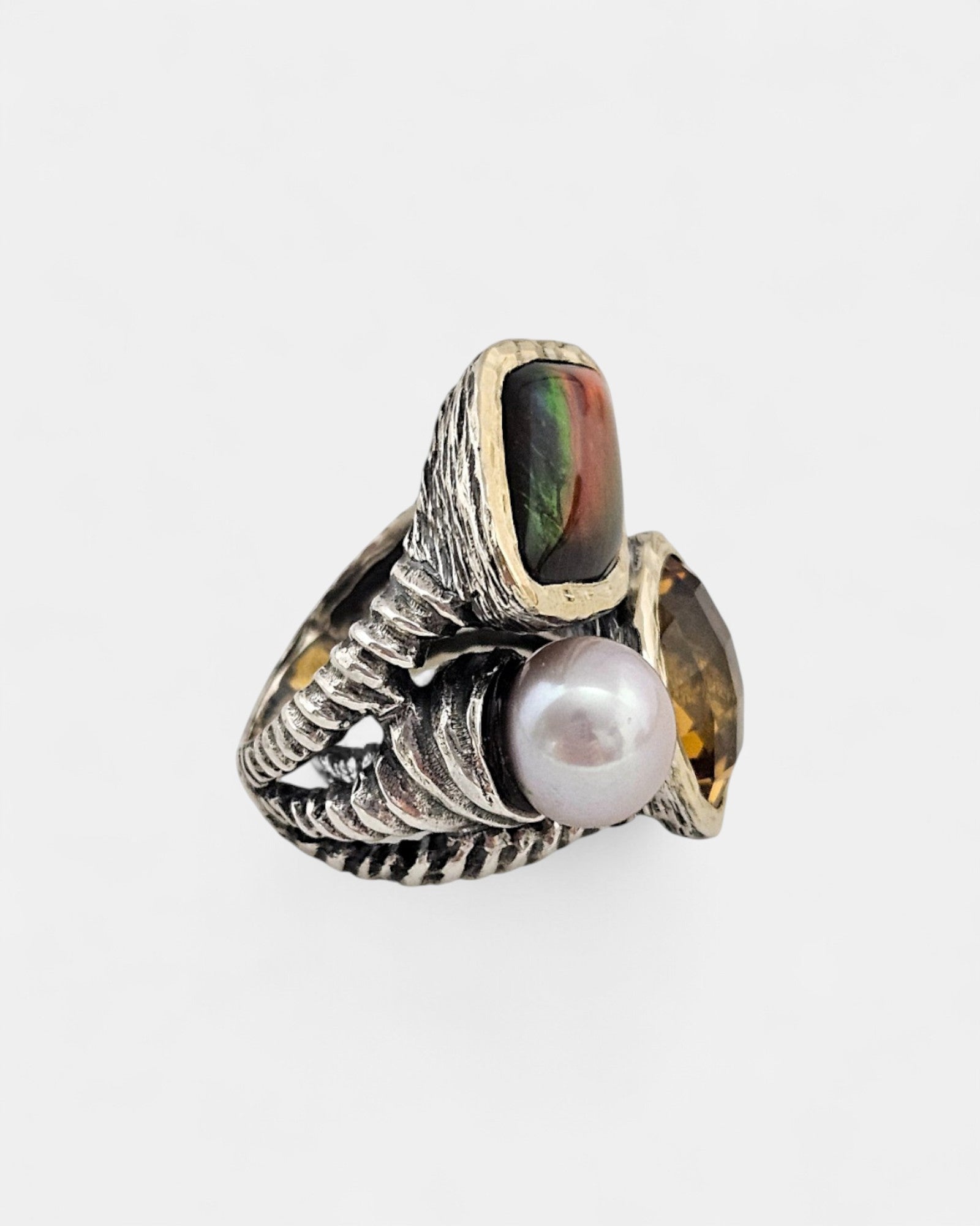 Sortija de plata con Quarzo whisky, perla y Amonite