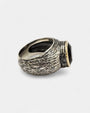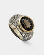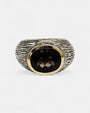 Anillo artesanal de Gabriela Styliano, elaborado en plata oxidada 925 con un engaste de oro amarillo de 18 kt.