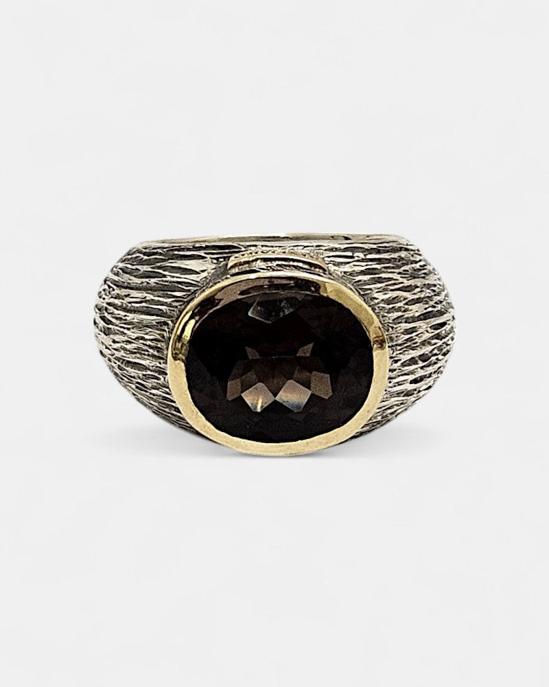 La pieza presenta un cuarzo ahumado facetado en talla oval, que resalta por su brillo cálido y profundidad.