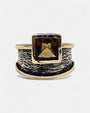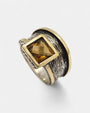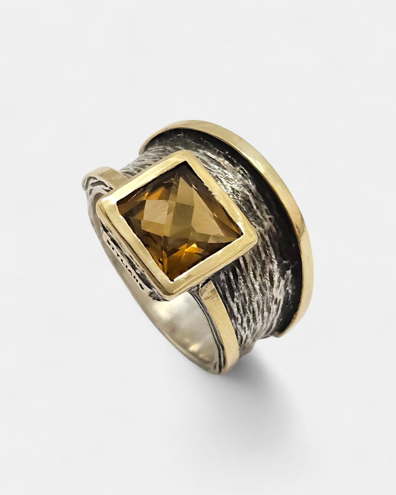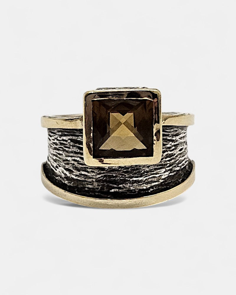 El diseño ancho y texturizado realza un cuarzo whisky natural en talla cuadrada facetada, engastado en oro martillado.