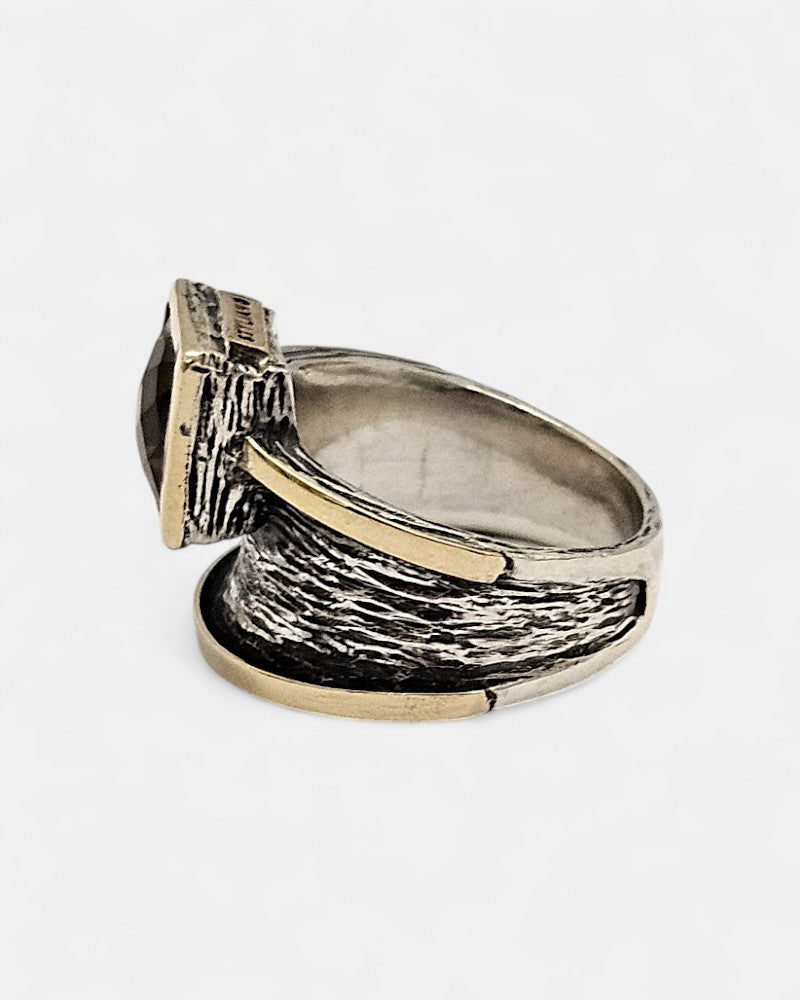 Anillo artesanal de Gabriela Styliano, elaborado en plata oxidada 925 con detalles en oro amarillo de 18 kt.