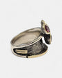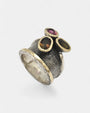Anillo artesanal de Gabriela Styliano, elaborado en plata oxidada 925 con bordes y engastes en oro amarillo de 18 kt.