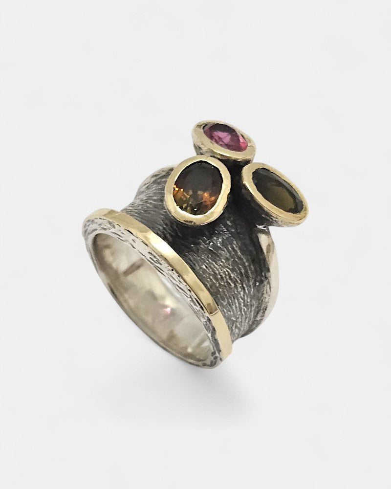 El diseño orgánico y texturizado destaca tres turmalinas naturales en tonos verde, dorado y rosa, dispuestas en diferentes alturas para crear volumen y movimiento.