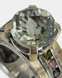 La pieza destaca por su amatista verde (prasiolita) en talla redonda, engastada con garras de oro, y una serie de turmalinas multicolor incrustadas en el aro que aportan contraste y luminosidad.