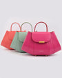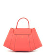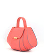 Realizado en piel de color coral con diseño estructurado y contrastado con bordes color azul